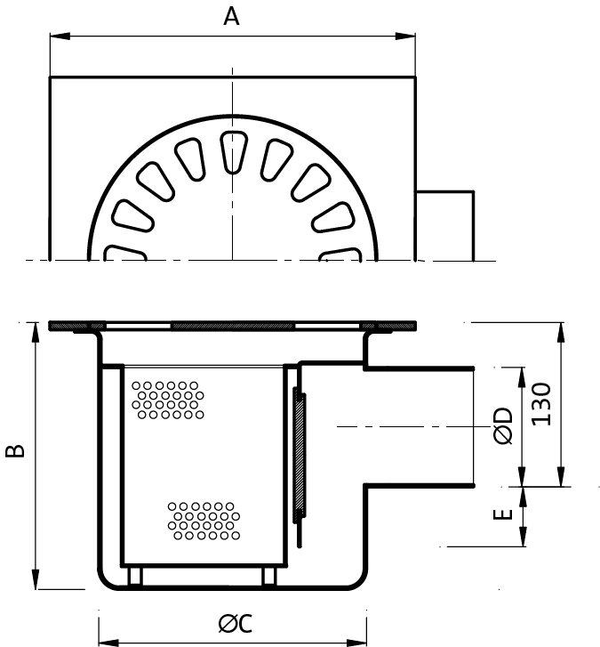Home / Sistemi di drenaggio / Chiusini e Pilette / Chiusino 250×250 mm con scarico laterale sul corpo ø 76/80 mm