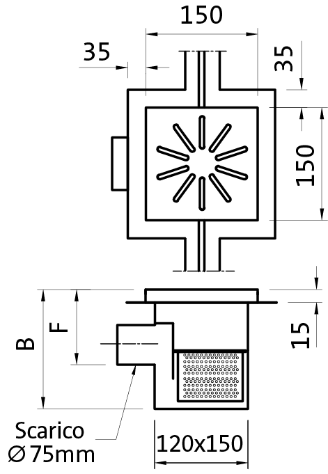 Home / Sistemi di drenaggio / Canale e Vasche / Chiusino a doppio innesto e scarico laterale per canaletta piscina