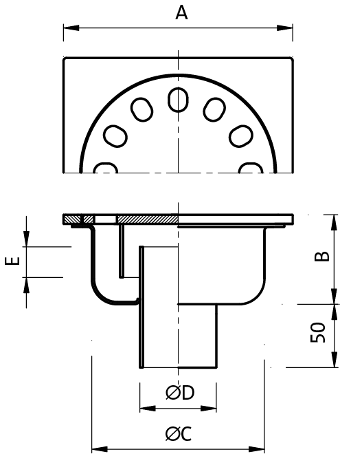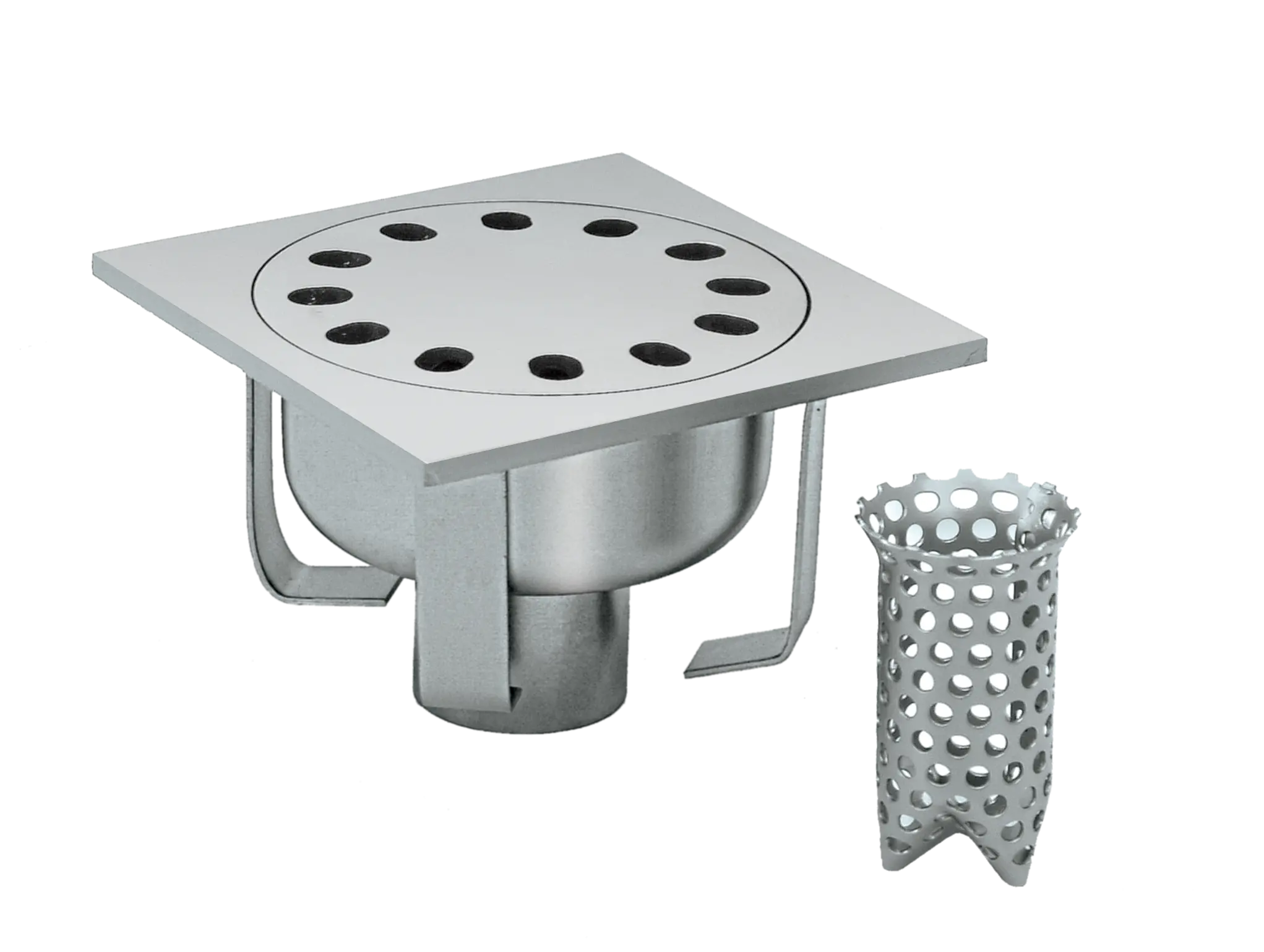 Chiusino ribassato 150×150 mm, scarico ø 50 mm